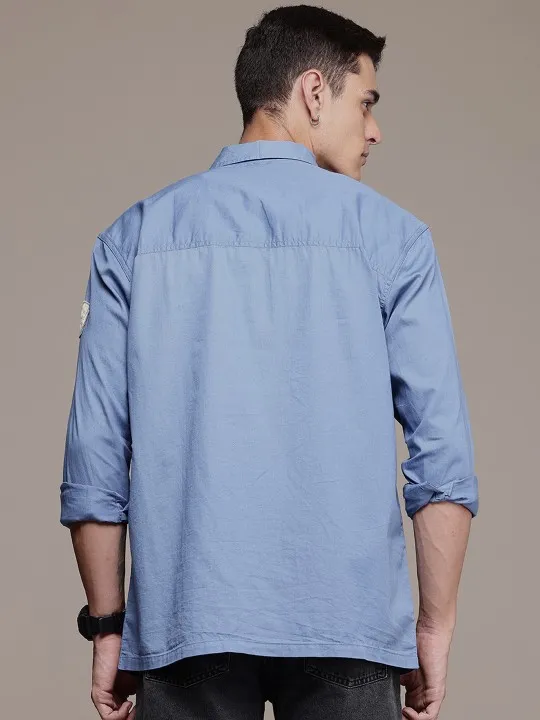 Men's Light Blue Casual Overshirt with White Tee and Black Denim Jeans